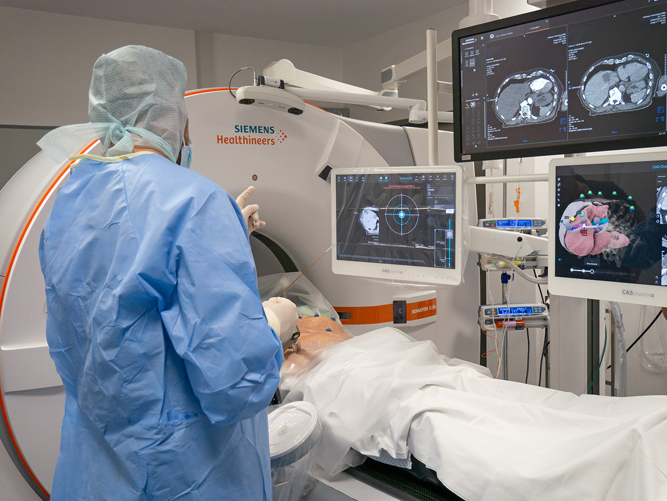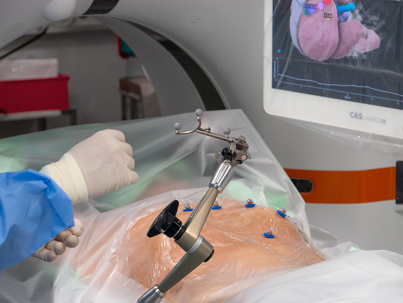 Als erstes Krankenhaus in der Region setzt unsere Abteilung dabei auf ein hochmodernes stereotaktisches Navigationssystem (Cascination CAS One IR). Diese Spitzentechnologie revolutioniert die Präzision interventioneller Eingriffe: Millimetergenaue Planung und Führung der Ablationssonden unter CT-Kontrolle ermöglichen eine optimale Tumorbehandlung bei maximaler Schonung des gesunden Gewebes.