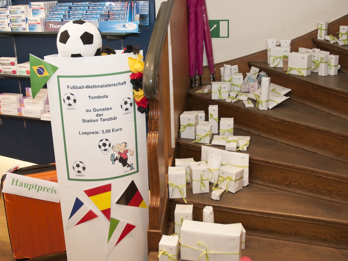 Also heißt es "Alle mitmachen!": Jedes Los (3,- Euro) gewinnt attraktive Preise und am Ende gewinnt natürlich auch die Station Tanzbär. Lose gibts in der Karmelitenapotheke am Marienplatz 1 in Würzburg. Die Aktion läuft noch bis zum Ende der WM in Brasilien.