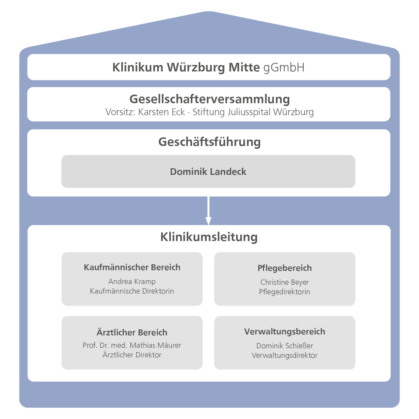 Das Klinikum Würzburg Mitte ist eine gemeinnützige Gesellschaft mit beschränkter Haftung (gGmbH). Das heißt: Die Gesellschaft ist selbstlos tätig; sie verfolgt nicht in erster Linie eigenwirtschaftliche Zwecke. Die Organe der Gesellschaft sind die Gesellschafterversammlung und der oder die Geschäftsführer.